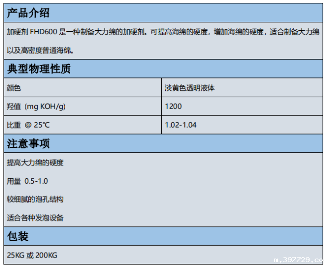 加硬剂 fhd600 是一种制备大力绵的加硬剂。可提高海绵的硬度,增加海绵的硬度,适合制备大力绵以及高密度普通海绵。